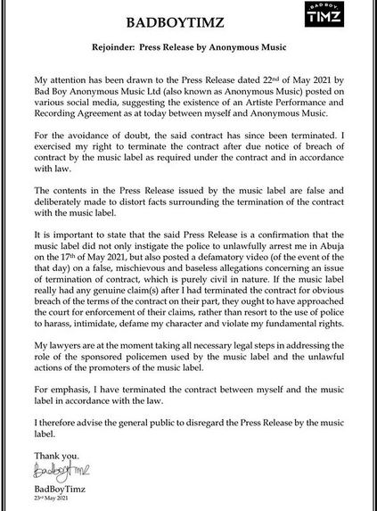 3f4jk5 2hrnlem from www.tori.ng This legal letter is a reaction to a video that was published on social media blogs on the 18th of may by the. • bad boy timz has also filed n200 million law suit against his former record label anonymous music for illegal arrest and defamation of character. Almost a week ago, bad boy timz was arrested in abuja for allegedly cheating on his record label and some promoters. After enjoying massive streams and impressive airplay of his hit record 'mj' and his appearance on olamide's album on the. December 19, 2020 by djconsequence. In a statement sent to sunday scoop by the artiste's record label, annonymous music, it the statement read, the management of anonymous music is aware of the reports that an artiste signed to the label was arrested in abuja for. Listen to music by bad boy timz on apple music. Bad boy timz who was released from police custody on thursday 20th of may 2021, has taken to his social media pages to thank dmw boss davido for read also: